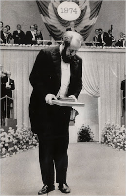 获得诺贝尔文学奖的索尔仁尼琴(1974年) 我们也是这般状况,手里拿着艺术,自信地以为我们自己是艺术的主人;我们大胆地指挥着它,更新它,改造它并显示它;我们出售它以挣钱,用它取悦当权者;时而用它来消遣——径直到唱流行歌曲的地方和夜总会,时而又为了转瞬即逝的政治需要和狭隘的社会目的而抓住最近的武器,不管那是软木塞还是短棍棒。但艺术并不因我们的所作所为而被亵渎,它也并未因此而偏离开自己的天性,而是在每一个场合、在每一次应用中它都把其秘密的内心的光的一部分给了我们。但是我们能理解那道光的全部吗?谁敢说他已经为艺术下了定义,已列举了它的所有的方面?或许曾几何时有个人已理解了并且告诉了我们,但我们却不能长期满足于此;我们倾听着,忽略着,当场立即把它掷了出去,一如既往匆匆地把甚至最优秀的也交换出去——但愿是为了换得某种新的东西!而当我们再次被告知那个古老的真理时,我们甚至将不记得曾经拥有过它。