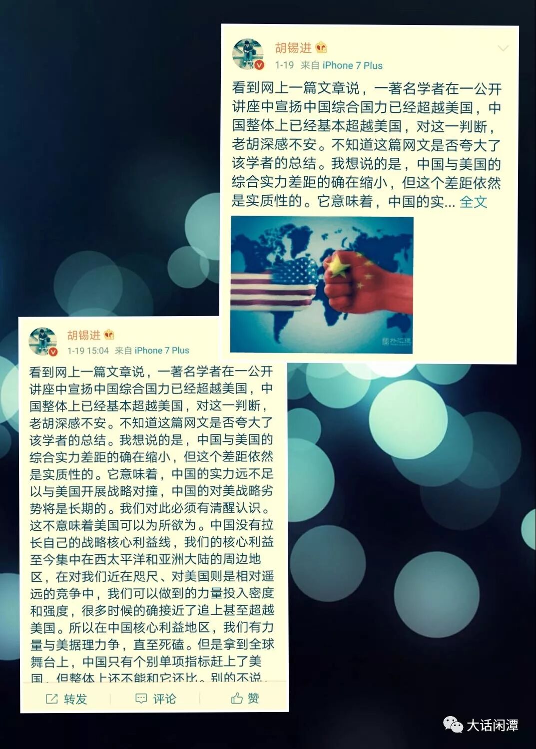 不是胡教授的所有同志都懂得,环球时报总编辑胡锡进说,他看了他本家的这项研究后"很不安",认为"中国与美国的综合实力差距的确在缩小,但这个差距依然是实质性的。它意味着,中国的实力远不足以与美国开展战略对撞,中国的对美战略劣势将是长期的。"
