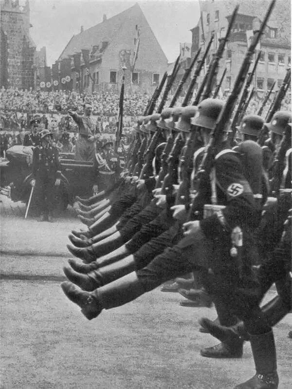 在纳粹的宣传下,德国民众热衷于宏大的群众集会,盛装大游行。在这种场合,军乐队演奏的瓦格纳的乐曲更显得激昂雄壮,数不清的"卐"旗迎风飞舞就像波涛汹涌的大海,成千上万的人发出的"HI,希特勒"的呼喊如同山呼海啸,伴随着德国军靴踏出的令人震慑的脚步声,勾画出一幅让人久久难忘"壮丽的图画"。1933年,一位英国记者曾亲眼见识了这样的场面。当他看到,纽伦堡的露天运动场中,6万多名德国男青年,在众目睽睽之下,拿着明晃晃的匕首,高呼着"BLUT AND EHRE"(即"血与荣誉永存"),用以象征德国已经为战争到来做好一切准备时,他不禁感到眩目和震惊。【《纳粹德国的兴亡》下中国社会科学出版社】
