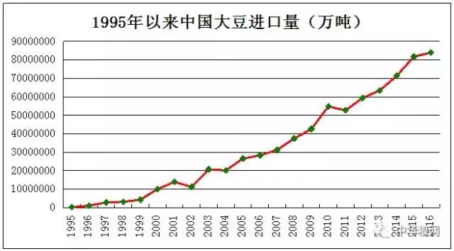 2017年中国粮食总产量6.1791亿吨,进口总量为1.3062亿吨,占比21.1%。其中大豆进口9554万吨,增加13.9%,国产大豆仅1000多万吨,对外依存度近90%。此外,大米(403万吨)、小麦(442万吨)、高粱(505.7万吨)、玉米(283万吨)、油菜籽(457万吨)也都需要大量进口。