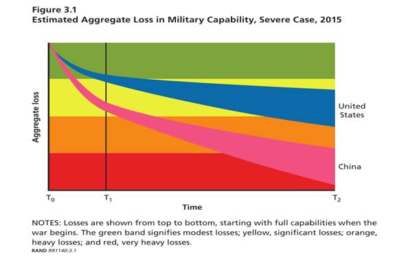 如果中美的任一方领导人授权他们的军事指挥官为实现战略计划对敌方采取有力的军事打击,一个高强度的武装冲突将可能爆发。在2015年,美国海空军力量将会损失重大,包括受损的航母和地区内的空军基地。但中方的损失将会更大,包括内陆地区的反介入/区域拒止系统。不用多久,双方都将会清楚地意识到,随着战争的持续,在战争早期就已对美军有利的战损比将会继续扩大。