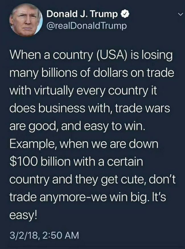 我英文虽然不好,但好在特朗普喜欢用简单的英文来表述其思想,看了特朗普这则推文真吓了一跳。我尝试翻译如下:"当我们美国与任何国家做贸易都要损失数以十亿计的美元时,进行贸易战对我们是好事,很容易贏。比如说:如果我们与其个国家做贸易每年损失1000亿美元,最好的办法就是停止跟它的贸易,非常简单!"