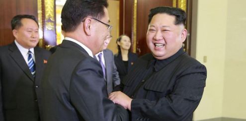 3月6日韩国赴朝特使团成员、青瓦台国家安保室室长郑义溶在记者会上表示,朝韩商定两国首脑将在4月底举行会谈更让人意外的是,朝鲜还承诺,在朝韩对话期间,朝鲜保证不会再进行核试验或是试射弹道导弹等挑衅行为。朝鲜表示, 为推动无核化和朝美关系正常化,朝鲜愿意与美国进行坦诚的对话它愿意与美国就放弃核武器进行谈判对于美韩4月重启的军演,金正恩还表示"理解"。