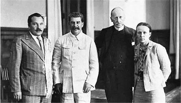 斯大林(左二)、罗兰(左三)与罗兰的第二任妻子玛丽亚(左四)在克里姆林宫的合影。