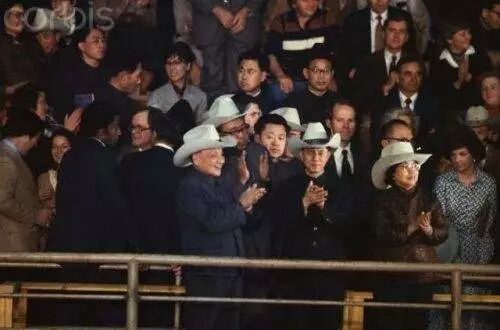 在休斯敦,邓小平观看了一场牛仔竞技表演。奥韦尔·斯科勒写道:"在他的助手、部长和翻译的陪同下……一位年轻姑娘骑马跑过来,送给他一顶牛仔帽。观众吹着口哨,欢呼着,十分兴奋地看着他把帽子戴在头上。通过这个简单的姿势,邓小平结束了中国与美国之间30年的不睦……结束了中国对西方历史性的抗拒心理。"[34]邓小平戴着大牛仔帽微笑的照片成了他访问美国的象征。