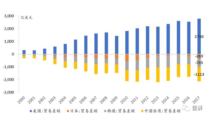 2017年中国对台、日、韩的逆差达2200亿美元之巨,如果缩小一半,跟美国人谈缩小1000亿顺差就会轻松很多。