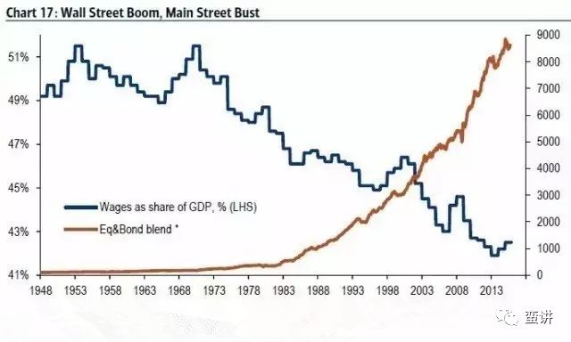 华尔街Wallstreet投资繁荣Mainstreet大众就业和工资萧条的反差,下图为美银美林统计的1948年至今美国股票债券市场总体回报指数上涨(红线)和工资占GDP百分比比率下降的情况(蓝线)