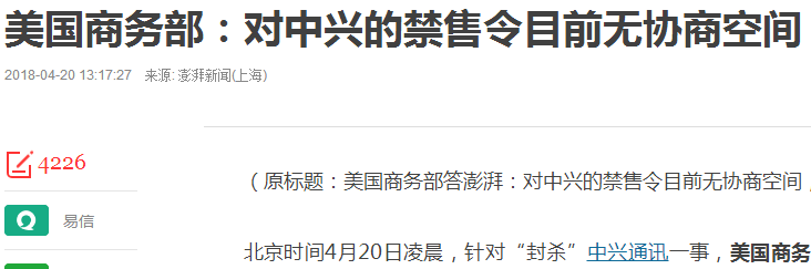 事情极为严重,中兴的几个老总,包括已经退休、我相当敬重的76岁的侯为贵,都亲自出马奔赴美国求情。可惜美国商务部在4月19日发声:没有协商空间!