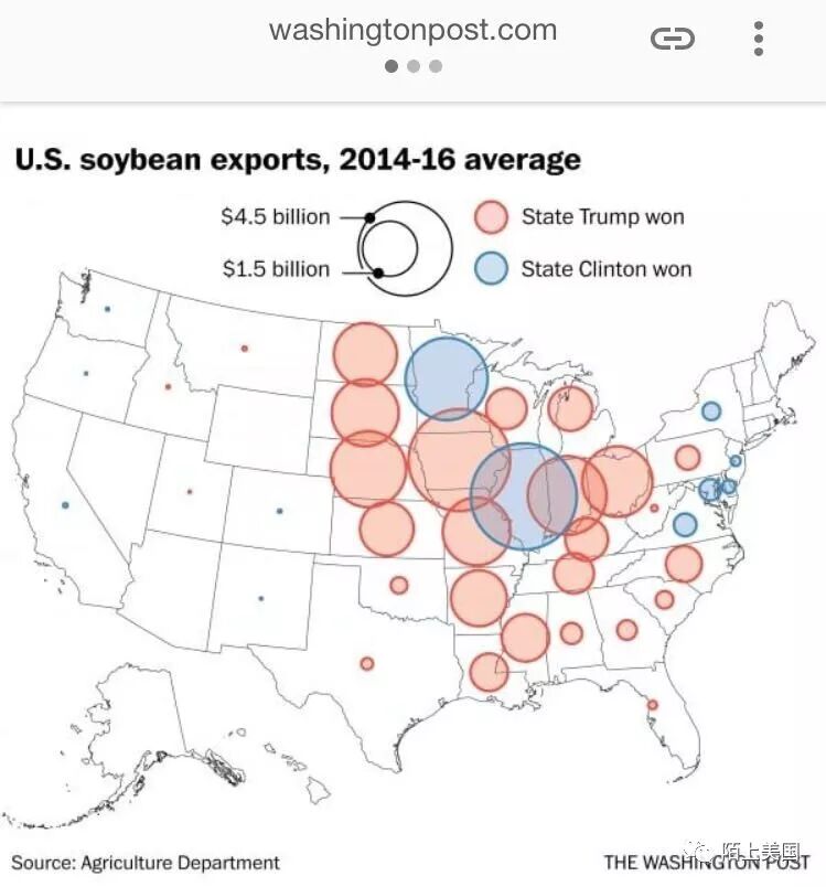豆农基本都在川普的票仓 美国农业部数据(来自华盛顿邮报)