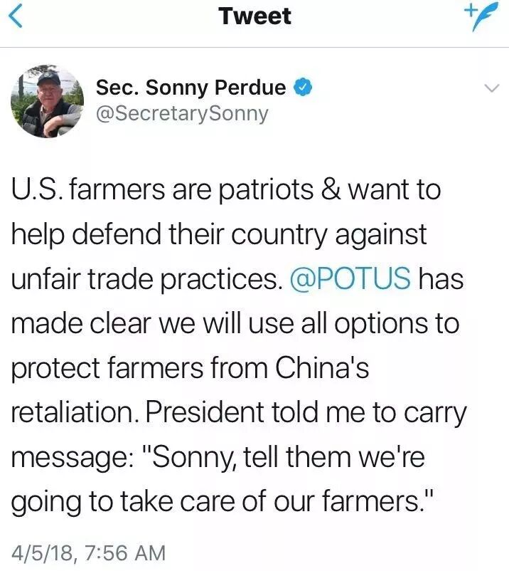 "美利坚的农民是愿意为扭转不公平的贸易政策而捍卫国家利益的爱国者。总统也传达了清晰信息,一旦中国对美国的农业出口进行制裁,国家会给我们的农民们做出补贴保证不受损失。"
