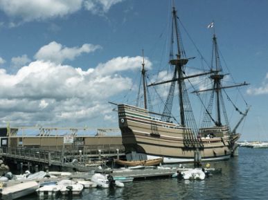第一个地方是普利茅斯,离哈佛一个多小时车程。那是英国移民到北美登陆的最早口岸,有"圣地"之称。我们去的那天是阴天,彤云密布,景色萧瑟。惟见远处一条大帆船停泊在海岸,五颜六色,显得特别鲜艳。走近一看,才知道是著名的"五月花"号,却是后人仿制的。