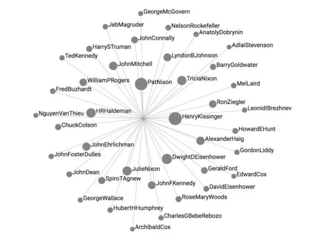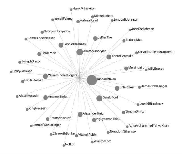弗格森基于公开出版的回忆录内容,绘制了尼克松和基辛格两人的人脉地图,在尼克松频繁提及的40人中只有3名外国人,他们分别是阮文绍(南越前总统)、勃列日涅夫、阿纳托利·多勃雷宁(苏联驻美国大使),而基辛格频繁提到的外国人却有16位,除了苏联人之外,还有诸如周恩来、安瓦尔·萨达特(埃及前总统)、果尔达·梅厄(以色列前总理)这样的外国领导人。