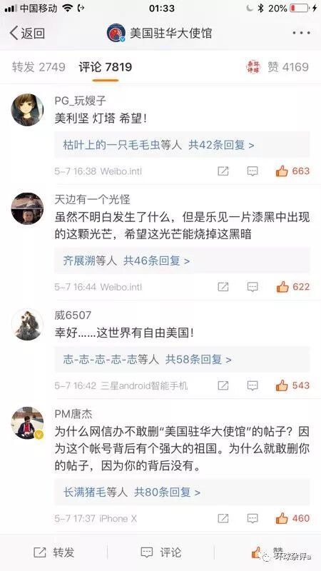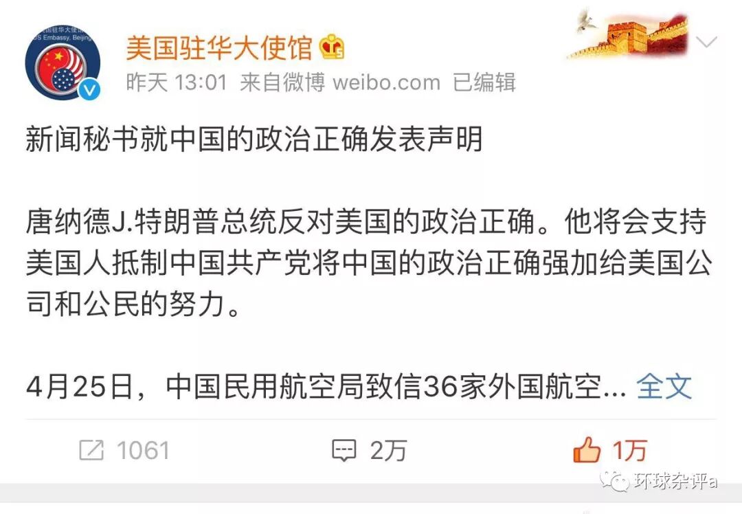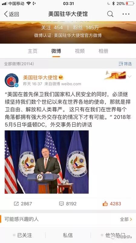 内心无比沉重、悲愤。建议每一个爱国小伙伴都去@美国驻华大使馆的微博浏览一番,里面的每一句话大概都是你们闻所未闻,如图二。简直就是特朗普射来的一封挑战书,性质要比任何洋人、洋企的任何侮华事件严重百倍、千倍,可竟然耀武扬威堂而皇之地占领了我们的微博阵地,并且安然无恙地活到了今天。