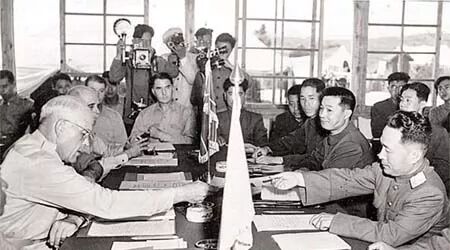 标志着战争结束的《朝鲜停战协定》是朝鲜、韩国、中国人民志愿军、联合国军四方联合参与的,但韩国因为不满内容最终没有签署。实际上最后起法律效力的文本是朝鲜大将南日和联合国军代表签署的。