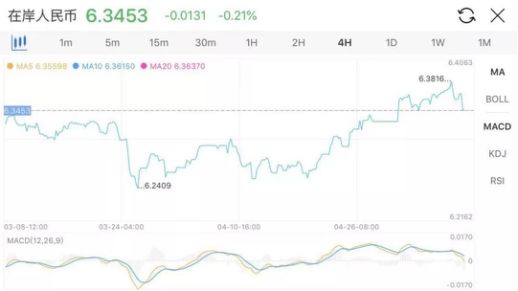 中国是最大的新兴市场国家,人民币自然也面临巨大压力。看看最近一段时间的CNY走势就一目了然。4月以来,在岸人民币已经从6.24贬值到6.38,贬值幅度2.2%。