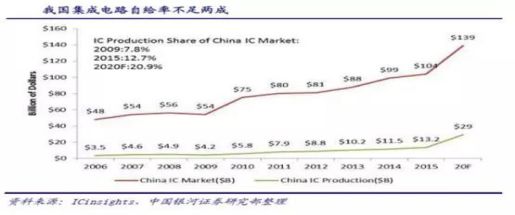 图2:我国集成电路自给率不足两成(来源:ICinsights,中国银行证券研究部整理)