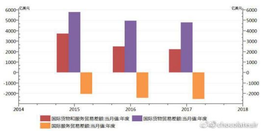 关于中美贸易,据美商务部统计,从1985年美方开始出现6亿美元的逆差到2017年美方贸易逆差达到3752亿美元,创历史新高,这32年美国对中国的贸易逆差总数为47380亿美元。而2017年对中国3752亿外贸逆差,占到当年整个美国外贸逆差的46%。