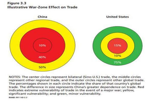 因此,中国与美国的双边贸易和与其他区域的贸易可能是极端脆弱的,而对美国来说,只有与中国的贸易会受到严重影响。总体而言,中国的大部分贸易(除了陆上的一小部分)很容易受到西太平洋地区的海运贸易中断的影响,而美国大部分贸易却不受影响。正如我们将看到的,一旦战争发生,这对(中美两国)GDP的影响是不对称的。