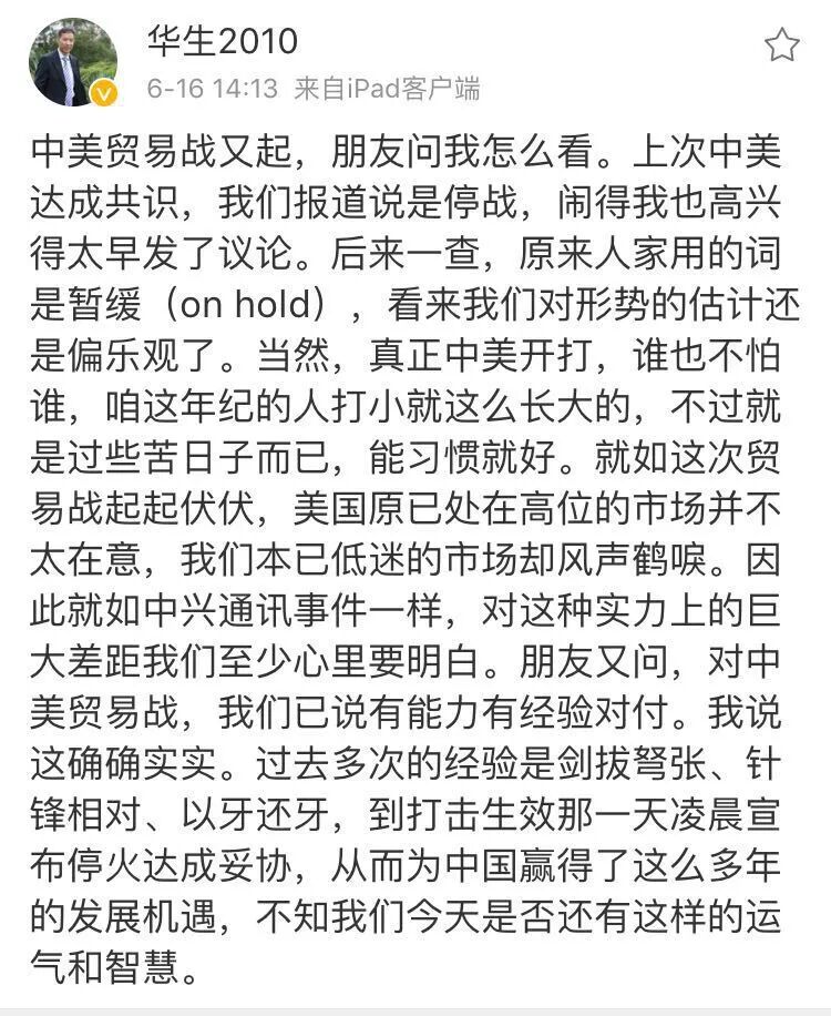 这一段时间,中美贸易战是大家关注的焦点,华生在他的微博上也写了一段话表达自己的看法,这段话也引来了许多人的关注,有支持和赞扬的,也惹来了一些媒体专门发文批评,于是,他就又写了一篇长一点的微博算作为一种回应。经华生同意,今天的"周说"把这篇发出,供大家参考。