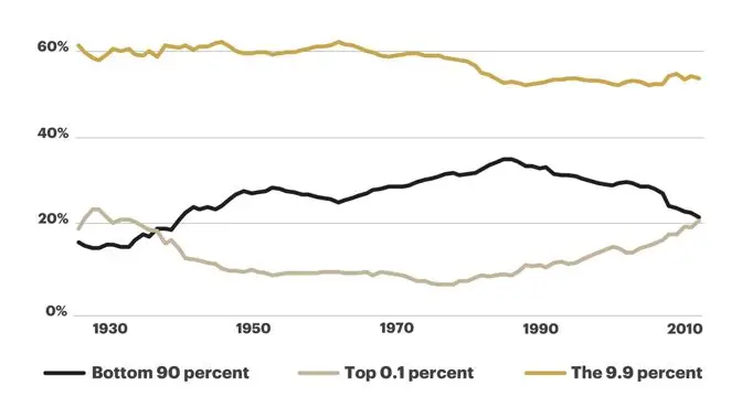 我们首先来谈谈钱——即便金钱不过是新贵族与众不同的原因之一。美国不平等日益加剧已经是老生常谈,其中各种定式化的人物角色也众所周知。化石燃料财阀、华尔街大亨、乳臭未干的科技新贵,以及其他人构成的所谓1%阶层,都是大反派。剩下的99%才是好人,又被称为"人民"或"中产阶级"。这样的叙事线很简单:我们曾经是平等的,但现在我们分裂了。这样的故事并非毫无真实性可言。但故事的人物和情节都存在基本的错误。