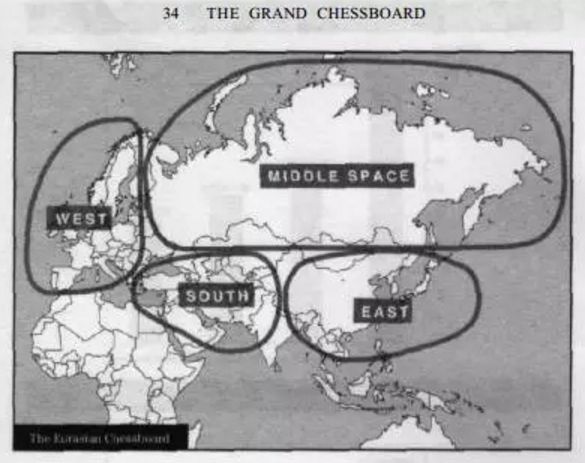 大棋局是苏联解体后,布热津斯基为美国谋划的二十一世纪的战略布局,它的中心思想就是:美国应在欧亚大陆这块世界上人口最多、自然资源最丰富、经济活动最活跃的板块上行使力量。欧亚大板块西起葡萄牙,东至白令海峡,北起芬兰,南至马来西亚,是一个巨大的、形状不规则横跨欧洲、中东和亚洲的"大棋盘"。欧亚大陆是全球面积最大的大陆和地缘政治的中轴。美国的主要任务就是处理欧、亚和中东的冲突和关系,防止任何潜在的超级大国崛起来威胁美国的利益。美国的安全和至高无上的地位取决于美国在这个大棋盘上通过合纵连横获得的认可或受到新兴力量崛起带来的挑战。