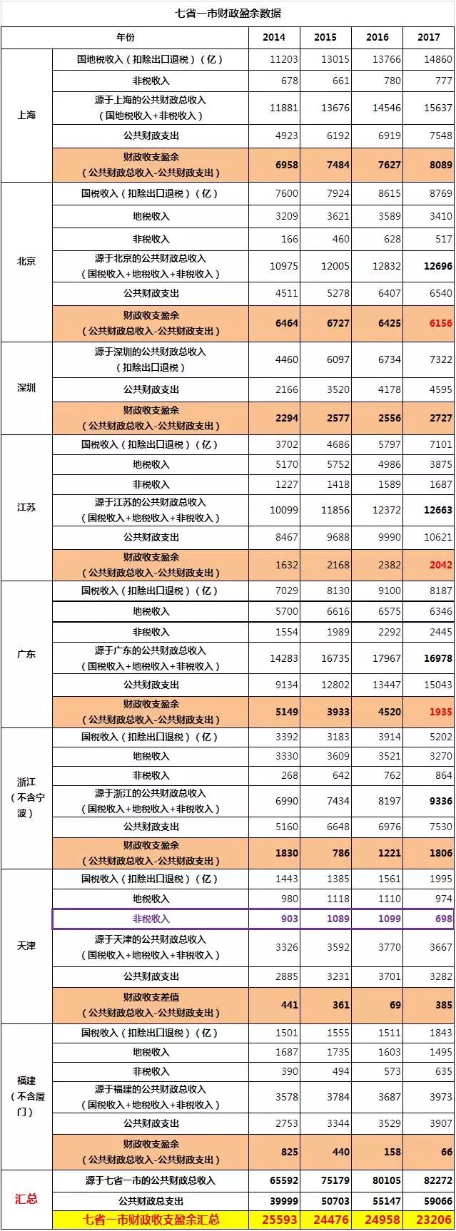 下表,是七省一市的财政盈余数据表,我建议各位认认真真的通读一次,建立起基础的数据概念。注意,我的排序方式是降序,根据2017年的财政盈余数据,由大至小进行排序。其中深圳放进本表的原因,在于它是虽然只是计划单列市,但其财政输血量非常大,仅次于北京和上海,因此要放在本表中,予以强调。此外,浙江的数据剔除了宁波,福建的数据剔除了厦门。