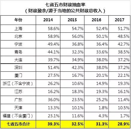 我们必须知道的是:我大中国中央政府是不会允许地方政府账上有长期盈余资金存在的。但凡今年你存了点钱,第二年一定会大幅增加你的国税上缴义务,务必确保抽干每个稍有盈余的地方政府的血。所以,接下来我们来算一个很有意思的数据:财政抽血率。用各省市的财政盈余数据除以源于该地的财政总收入,就能算出它们为中央财政做出的贡献率了。下表的排序方式,是按照2017年的抽血率从高至低排列。