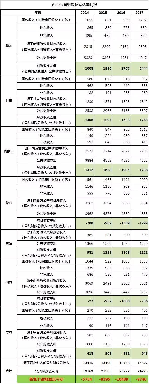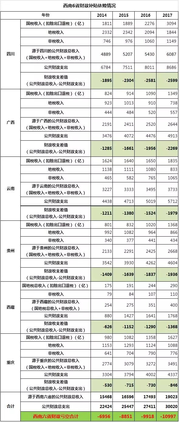 西南地区的财政情况,当然会不会比中部省份好到哪里去。西南六省2014年合计亏空6956亿,到2017年增加到10997亿,增幅58%。西南地区尤其值得一提的是西藏地区。以2017年为例,源于西藏地区的财政总收入400亿,但是中央财政补贴规模达到1748亿,补贴是收入的4.37倍。