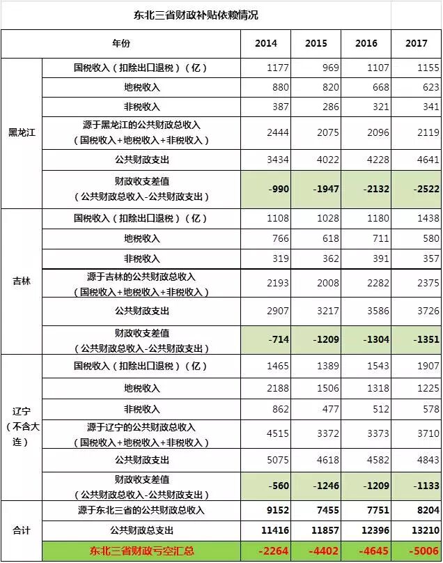 注意,2014年东北三省的财政亏空规模仅2264亿,2015年剧烈上升到4402亿,几乎算是翻番,这一方面由于东北地区从2015年开始数据挤水分,地方政府不愿意再虚增财政收入数据,另一方面也是由于当年度煤钢等大宗商品价格暴跌,以致高度依赖煤钢产业的东北三省财政无以为继。此后东北三省财政亏空规模缓步上涨,到2017年小幅增加到5006亿。从这样的数据来看。2016年以来的煤铁价格暴涨,并没有给东北经济带来真正的改善。