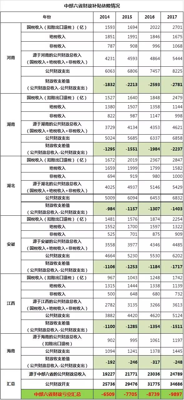 中部六省其实近年来风头很劲,河南安徽湖北湖南地区都算是经济明星,连江西都经常出来刷存在感。中部省份这些年来一直在努力承接东部的产业转移,但是从数据上看,这种产业承接工作算不上成功。当然,事实上我们也知道,东部的企业主们的优先选择是迁往东南亚国家。因为这样的原因,中部地区的财政亏空规模一直持续放大。2014年的财政亏空规模6509亿,到2017年提升到9897亿,涨幅达到52%。
