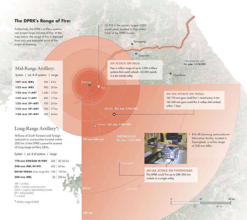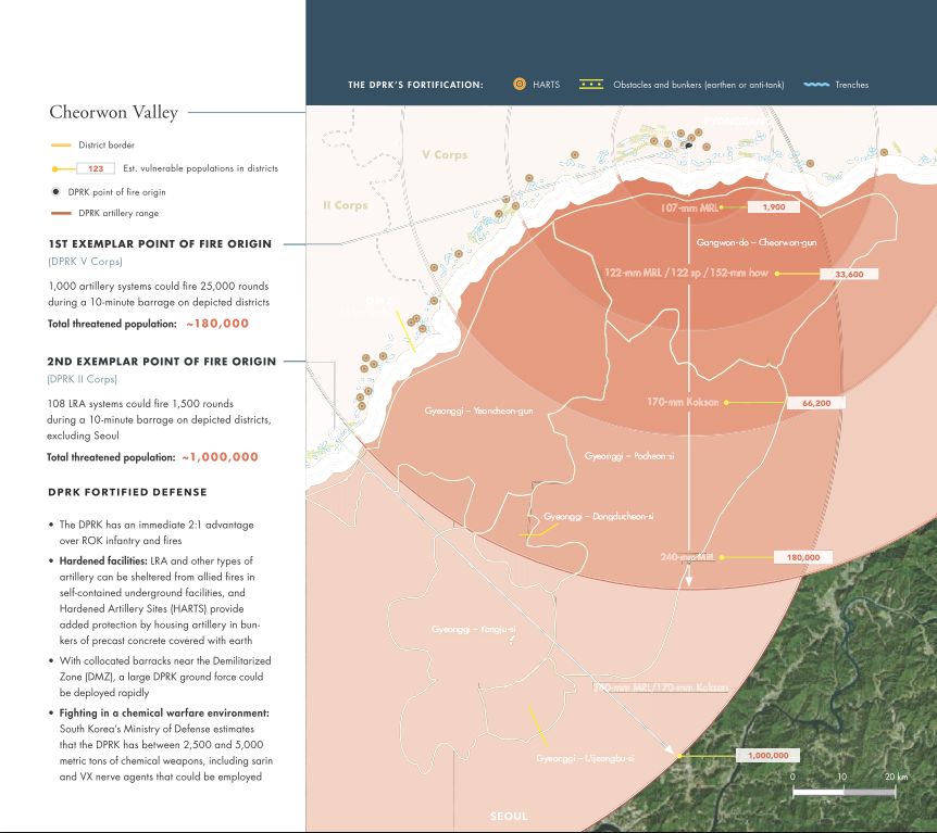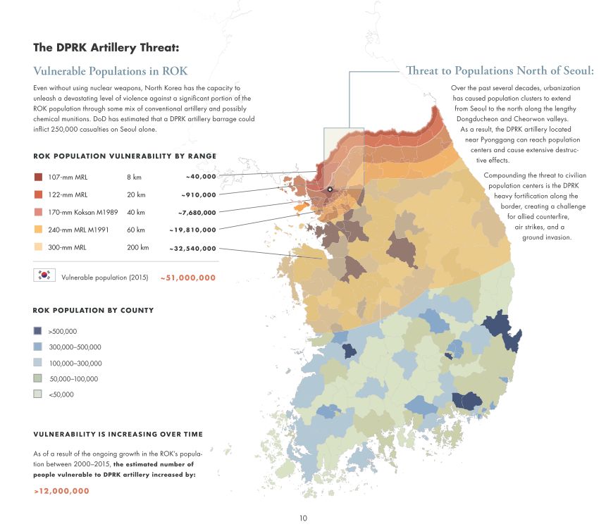 兰德中心的分析师们考虑了一种有限的战争情况:其中敌对行动开始于朝鲜对韩国的首尔大都会地区受到限制的一系列目标实施间歇性远程炮击,而这种炮击可以作为胁迫举动,以此从韩国和美国获得让步。即使没有核武器,对朝鲜炮兵能力的开源预估也表明,在一次10分钟的大规模攻势中,朝鲜可能向首尔市中心发射近5000枚远程炮弹,并在首尔大都会地区发射25,000枚炮弹。鉴于韩国50%的人口和70%的经济活动在首尔大都市区,这可能对韩国造成灾难性的威胁;对美国及其地区盟友而言。则增加了核问题升级的相关风险。美国国防部估计,这样的炮击一旦发生,可能造成首尔25万人伤亡。
