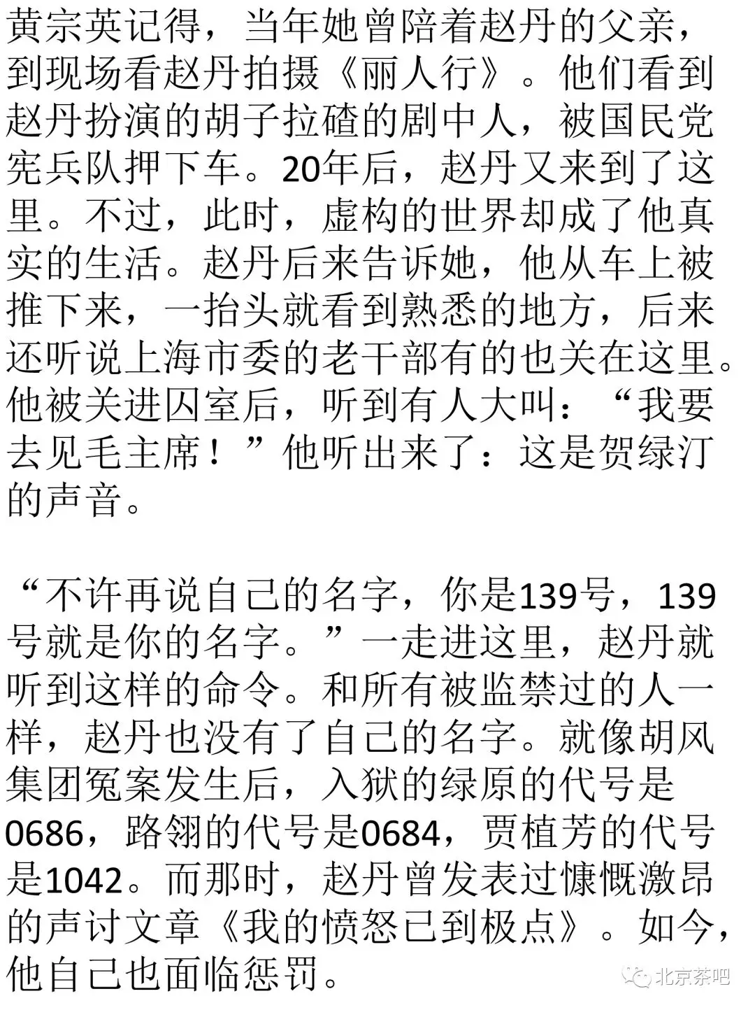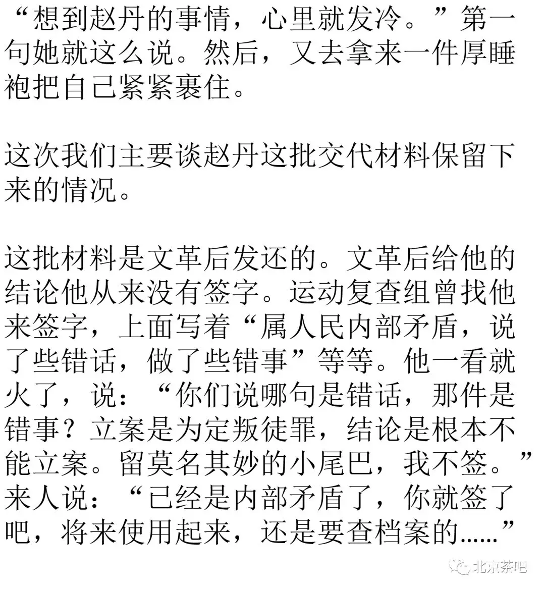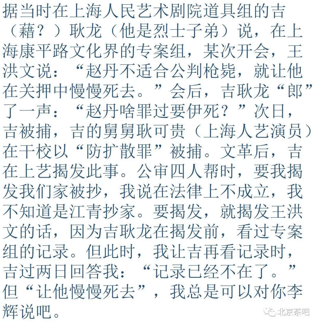 在精神上的折磨,典型的是后来。实在交代来交代去没什么可写了,就叫赵丹倒着年份、月份、日子、钟点交代,从12月31日午夜12时往前交代。赵丹说他写了两天后,早上起来就摔跟斗,呕吐了。所以,他骂专案组"比法西斯还法西斯"。赵丹骂得最利害的几页,已被从交代簿中撕去,缺页。点击观看:中央御用301医院!领导人们如何面对死亡