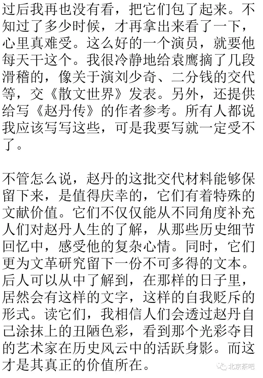赵丹的交代材料拿回来,是在他去世之后。过了一些日子,上影厂落实政策办公室来找我,说:"复查组重新讨论了,结论也重新写了。"我一看,大意是:"一切不实之词予以推翻。"他们要我签字,我说我不能签。后来,我就让他们把交代材料留下,但没有在结论上签字,这就是说,赵丹的问题至今也没有最后结论。赵丹逝世后,我写了一篇八百字的文章《人民了解他》。我心想,有没有结论又有什么了不起呢?他留下了银幕上的形像,够了。