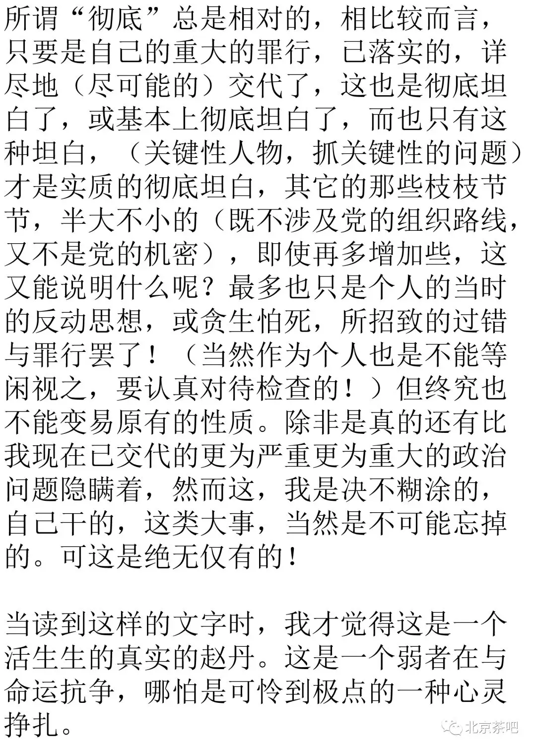 我的面前到处是可怕的、黑洞洞的陷阱。我感到绝望了,我还有什么出路、前途可言呢?这种种莫须有的事,根本就是你们的主观唯心主义的多疑,神经过敏,其实质是你们的"以己之心度人之腹"的错误判断,都硬朝我的头上来安,硬要我来"自发地承认"这条"严重的罪行",这能使人相信你们是"为了我的前途和我的儿女们的前途着想"吗?你们这样做还能让人相信"这是对革命负责与对我个人前途负责的一致性"吗?!