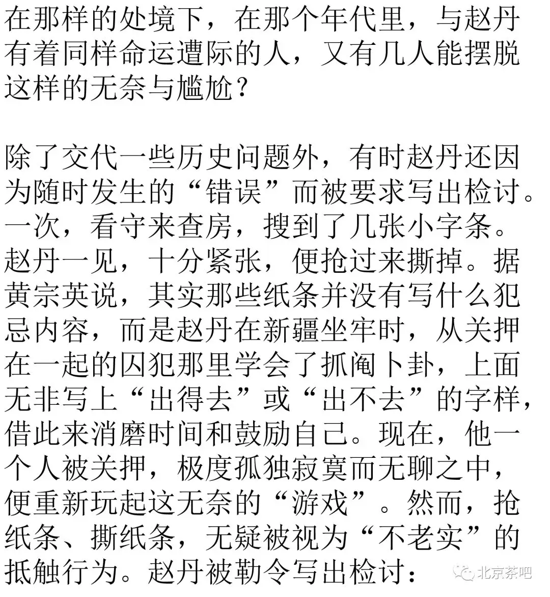 然而,在复杂的历史被绝对化、简单化的年代里,有过如此经历的赵丹,又如何能摆脱无休止的折磨呢?从入狱开始,一直到1971年,仅在黄宗英交给我的这部份交代中,就有好几次长篇历史交代,特别是关于新疆生活的。他不得不苦苦搜寻记忆,反反复复把同一件事、同一细节写出来。