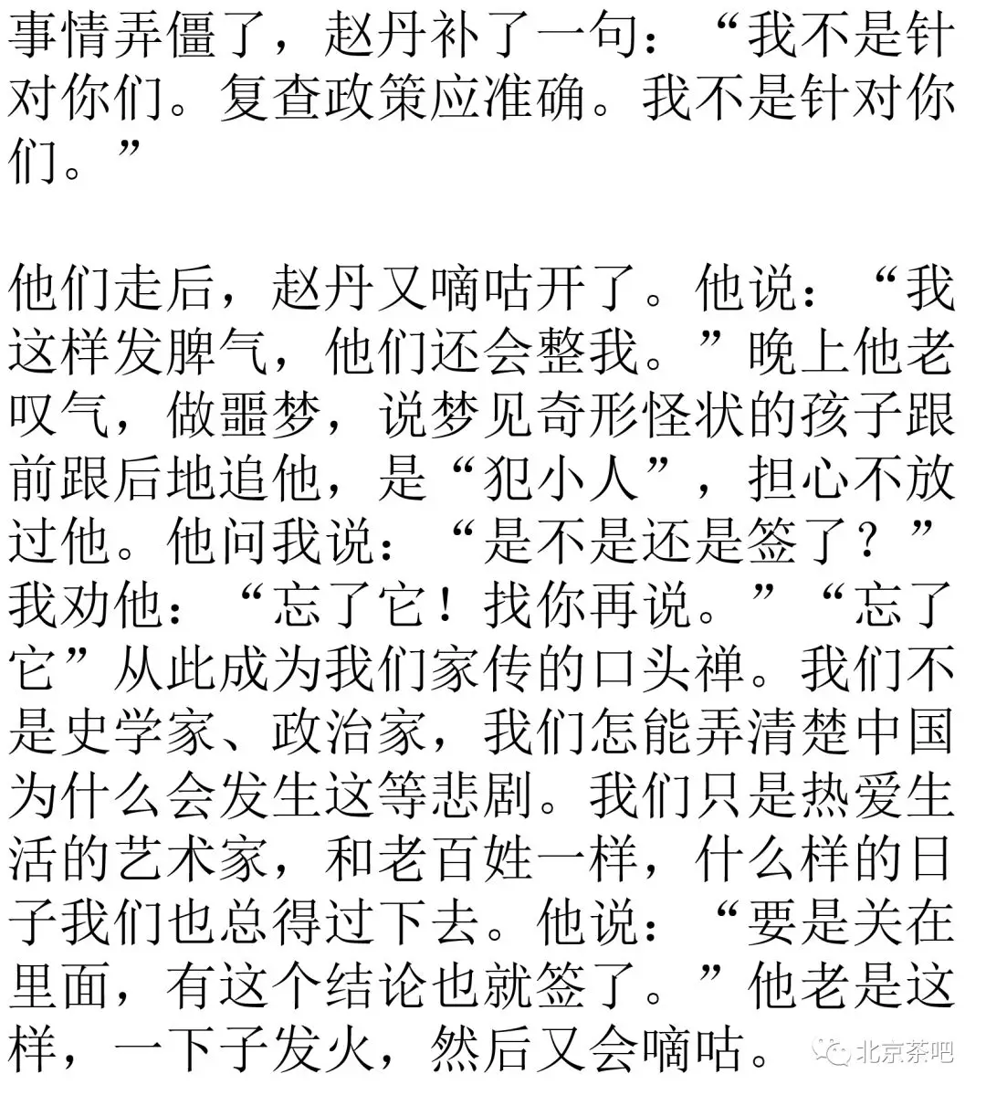 我把阿丹的"交代"给你时,心里也很嘀咕。当时(1980年冬)上海电影局运动复查组交回的两大捆材料上,盖着一张大纸,上书:予以销毁。发还给家属就是表示"不留档案",由家属亲自销毁。我若仅是家属,当然会销毁吧。毕竟是红色恐怖高压下,严刑拷打摧残下,无所不用其极的精神折磨下被逼迫写的。阿丹若活着,他会怎样对待这两大捆交代?!我想不出。请你设想阿丹在九天九地看了《再》,究竟会是什么表情?我心忐忑。虽然阿丹生前曾说:"我以后写回忆录,一定写真真实实的自己和身边的人,决不拔高。……"