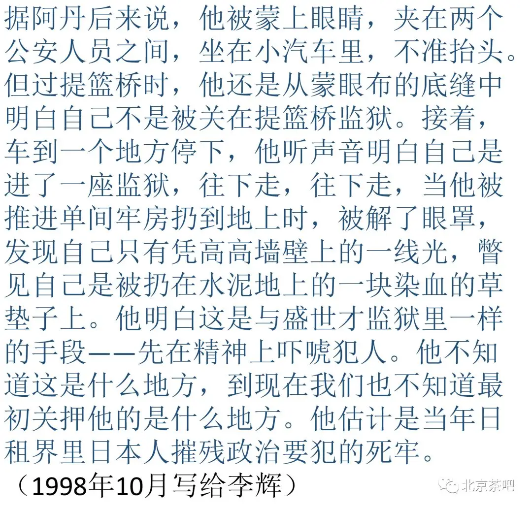我跟你谈阿丹时,没谈到他在文革狱中屡遭殴打,可能因为受到"在国际法中,政治犯在狱中不可以严刑殴打",以及文革中文革后都散布的"把某些人关起来是为了保护,免得被群众打死"的舆论的影响。我仿佛也没有看见哪篇狱中纪实说到打犯人、犯人挨打。是在粉碎四人帮之后,阿丹才敢告诉我: