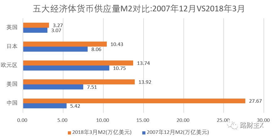 我赶紧去查阅了2018年3月份美国、欧元区、日本和英国的广义货币供应量M2数据和GDP数据,于是得到了全球五大经济体的对比(见下表)。