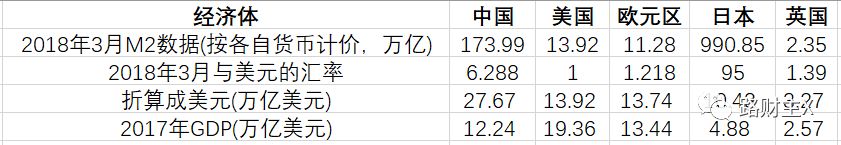 我赶紧去查阅了2018年3月份美国、欧元区、日本和英国的广义货币供应量M2数据和GDP数据,于是得到了全球五大经济体的对比(见下表)。