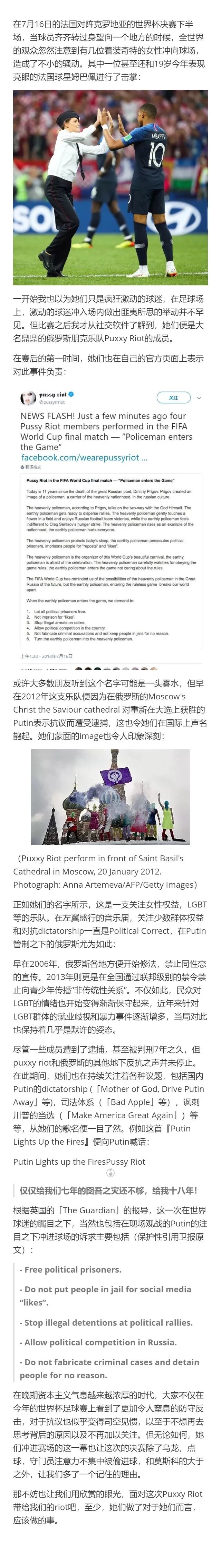 当这三个女生穿上彩色衣服与面罩,在俄罗斯东正教最受尊崇的「救世主大教堂」进行他们所谓的「庞克祈祷」,演出《圣母玛利亚,把普京赶走》时,一定没想到这四十秒的快闪会让他们遭受牢狱之灾,让他们成为国际知名人物,并且进入抗议音乐的历史名人堂之中。