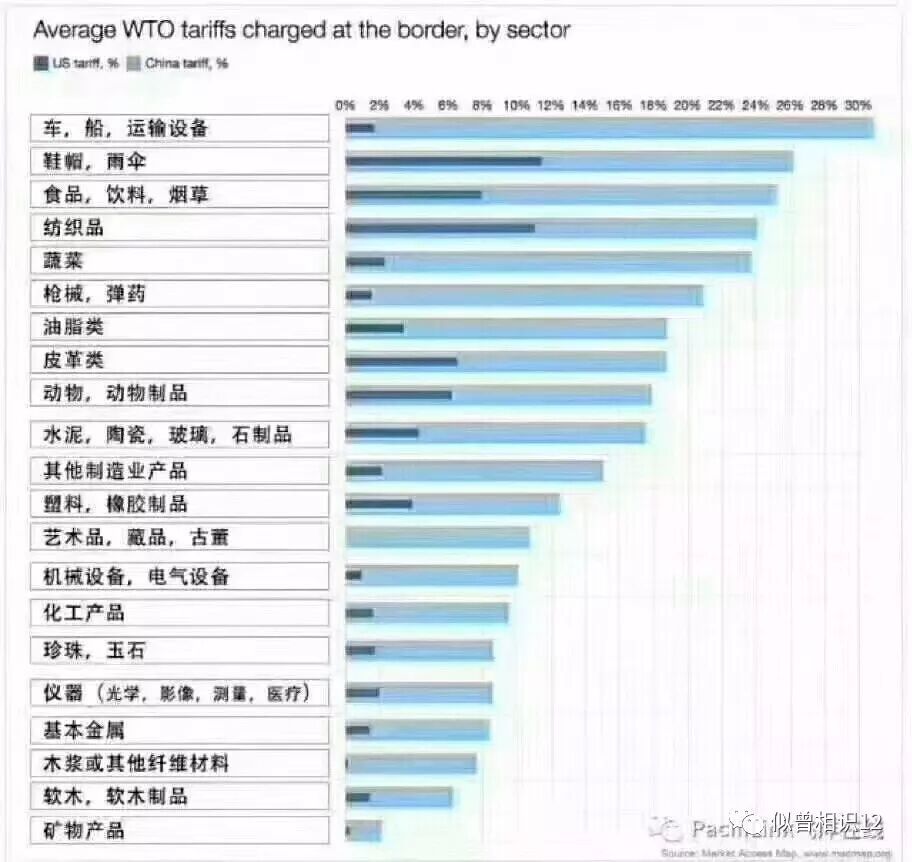 中美关税比较,浅蓝是中国,深蓝是美国。