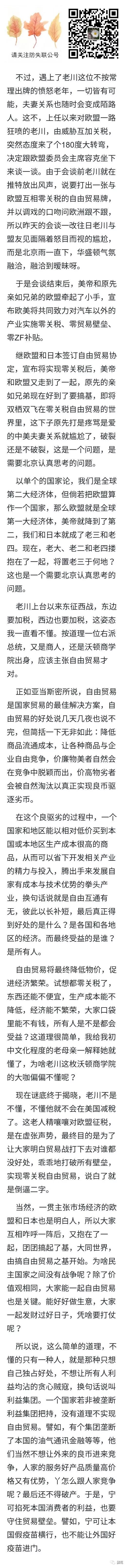 OK,这是题外话,言归正传,欧盟插足,中美夫妻关系是否一定破裂?依我看,未必。老川对盟友是倒逼,对另一半也未尝不是在倒逼,就看我们是不是跟欧盟一样一点就透。“不惜一切代价”“奉陪到底”啥的喊喊是可以的,虽说代价就是我,我就是那个底,但总不能真让十来亿个我啃树皮吧?所以,跟美国和其盟友的生意还是要做的,但人家有一个前提,就是市场经济自由贸易。
