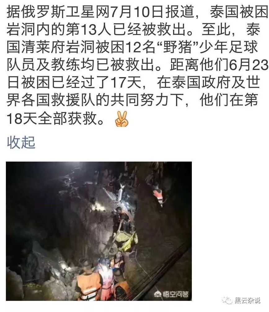 泰国少年足球队被困溶洞事件,全世界都在救。这边看,美国钢铁侠马斯克出技术一天就研发出设备,马上私人飞机空运泰国。那边看,澳大利亚潜水高手放下手中的工作,飞奔泰国联合救人。截止目前,所有人已经全部脱困!