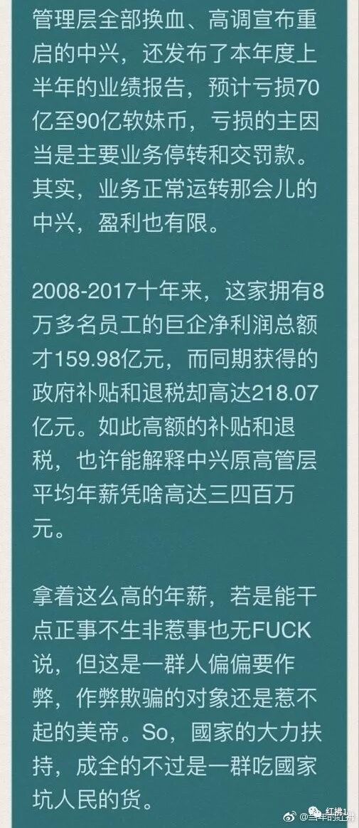 中兴被禁售,原因瓜友都知道,是违反了美帝对伊出口禁令,偷偷向伊出口了配备有被列为禁售品的美产芯片的通讯设备。这种行为叫做什么呢?叫做作弊。当初中兴的作弊行为被查出,为此付出了罚款8.9亿美元的惨重的代价。但中兴上上下下一脸嘻嘻哈哈,没把处罚的附加条款当回事,继续作弊,楞给处罚名单上的35名员工发了年终奖。