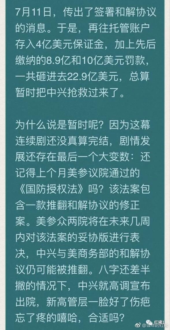 作弊小动作再度被查出,当时美帝就震惊了:还有这种不知死活的人和操作?于是,4月16日一纸禁售令重拳出击,直接把中兴锤进了重症监护室。近三个月了,病情反反复复,一会儿解禁,一会儿复禁,幕后的种种协商妥协不足为外人道也,一句话:为把中兴抬出重症监护室,大國尽力了。