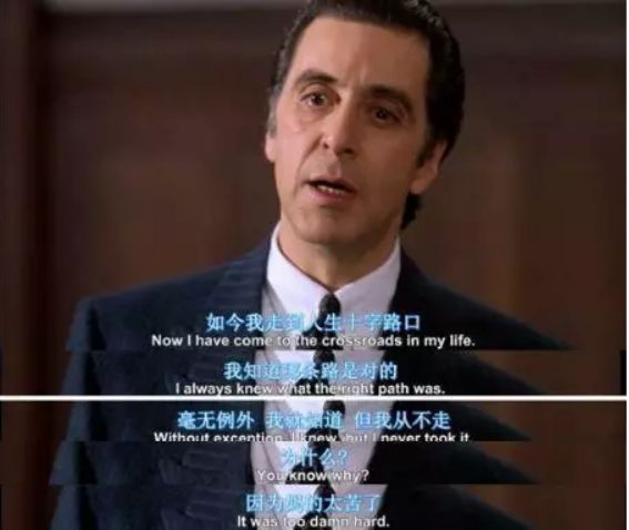 电影《闻香识女人》里有句台词:"每次走到人生的十字路口,我都知道哪条路是正确的,但我从不走,因为太艰难了。"