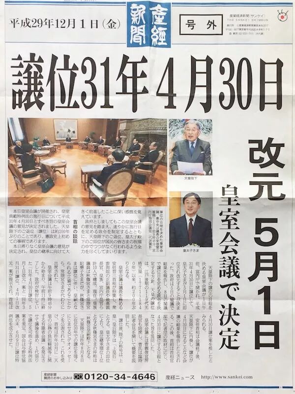 平成天皇退位的号外(产经新闻,平成二十九年12月1日号)