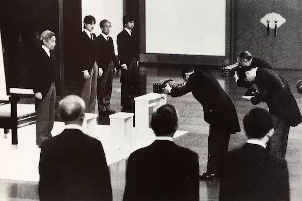 1989年1月7日,皇居宫殿松间,平成天皇明仁继承皇家三件神器(剑、曲玉和国玺)