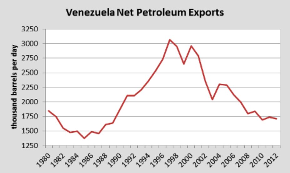 因为国有化,超级福利,这种大锅饭导致委内瑞拉人根本没有多少劳动的积极性,所以,委内瑞拉石油生产能力不断下降。目前,每天石油生产能力仅为150万桶,是30年来的最低点。