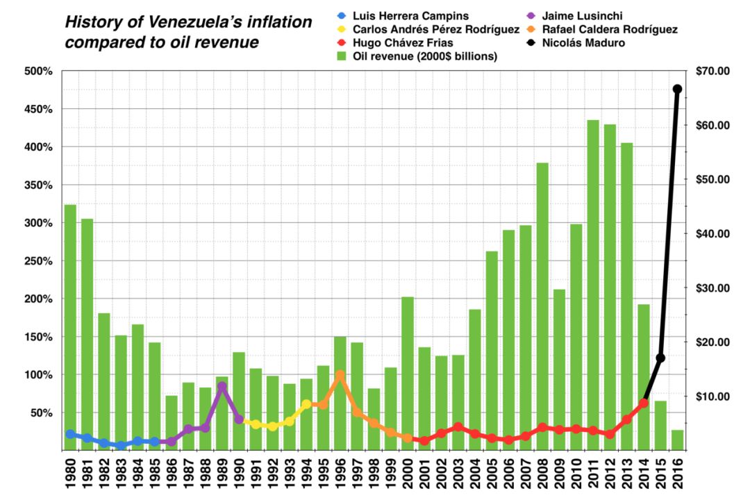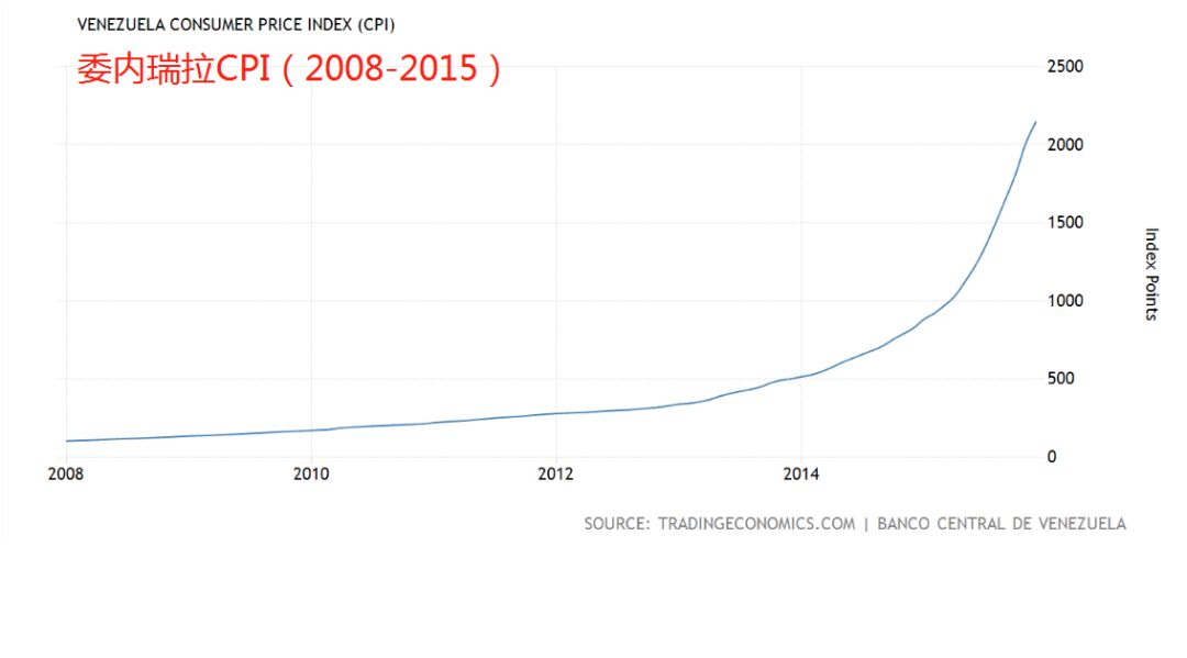委内瑞拉已经连续多年遭受恶性通货膨胀,因为经济数据太不好看,官方停止公布部分重要经济数据,但根据相关机构研究显示,其通胀率2016年达到800%,2017年超过2700%。